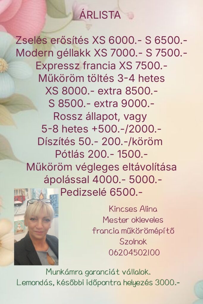 A műköröm készítés árai Bruttó árak, és az alábbi tételekből állnak: